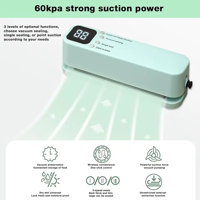 - Versatilidad de Sellado: Capaz de trabajar con bolsas de vacío específicas o simplemente cerrar bolsas de plástico convencionales para evitar derrames.